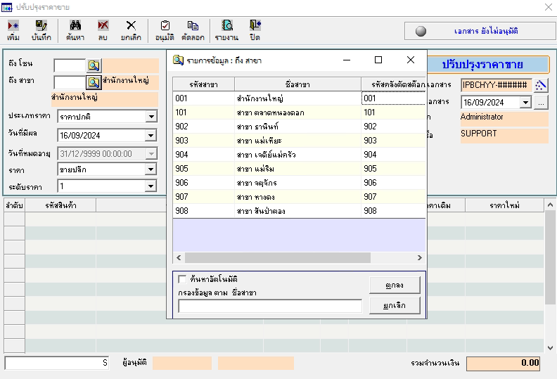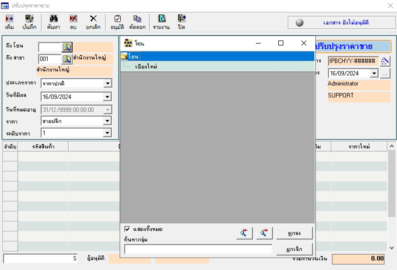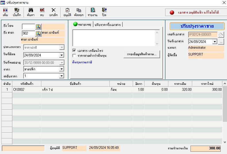 ระบบสามารถสร้างเอกสารการปรับราคาสินค้าโดยสามารถกำหนดระดับราคาที่ต้องการปรับ สามารถปรับเป็นจำนวนบาทหรือเปอร์เซ็นต์ กำหนดวันที่มีผลและยังสามารถกำหนดสาขาที่ต้องการปรับรวมถึงโซนที่ต้องการปรับสินค้าได้