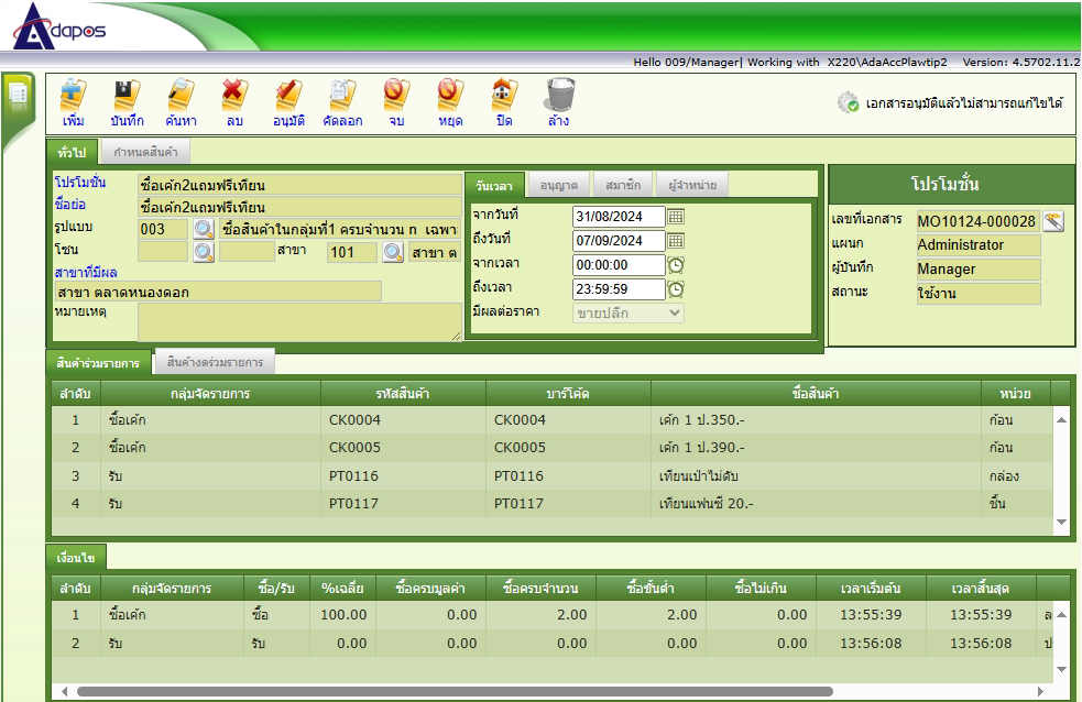 - รูปแบบโปรโมชั่นสามารถกำหนดเงื่อนไขได้ตามช่วงวัน, เวลา, สำหรับสมาชิก และการให้แต้มสมาชิกโดยสามารถซ็อนโปรกันได้ในรหัสสินค้าตัวเดียวกัน