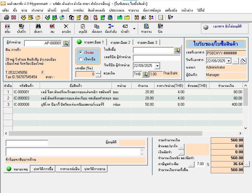 ใบรับของ/ใบซื้อสินค้าเป็นเอกสารที่ทำเมื่อผู้จำหน่ายมาส่งสินค้า การสร้างเอกสารนี้เมื่อผ่านการบันทึก-อนุมัติ แล้วจะเพิ่มจำนวนสินค้าในสต็อกตามจำนวนที่รับ และเกิดรายงานภาษีซื้อของสินค้านั้นๆ เอกสารซื้อ เราสามารถอ้างอิงจากเอกสารใบสั่งซื้อกับผู้จำหน่ายโดยตรง หรือ ในกรณีที่ไม่มีใบสั่งซื้อ ก็สามารถทำข้อมูลการบันทึกได้ เช่นกัน